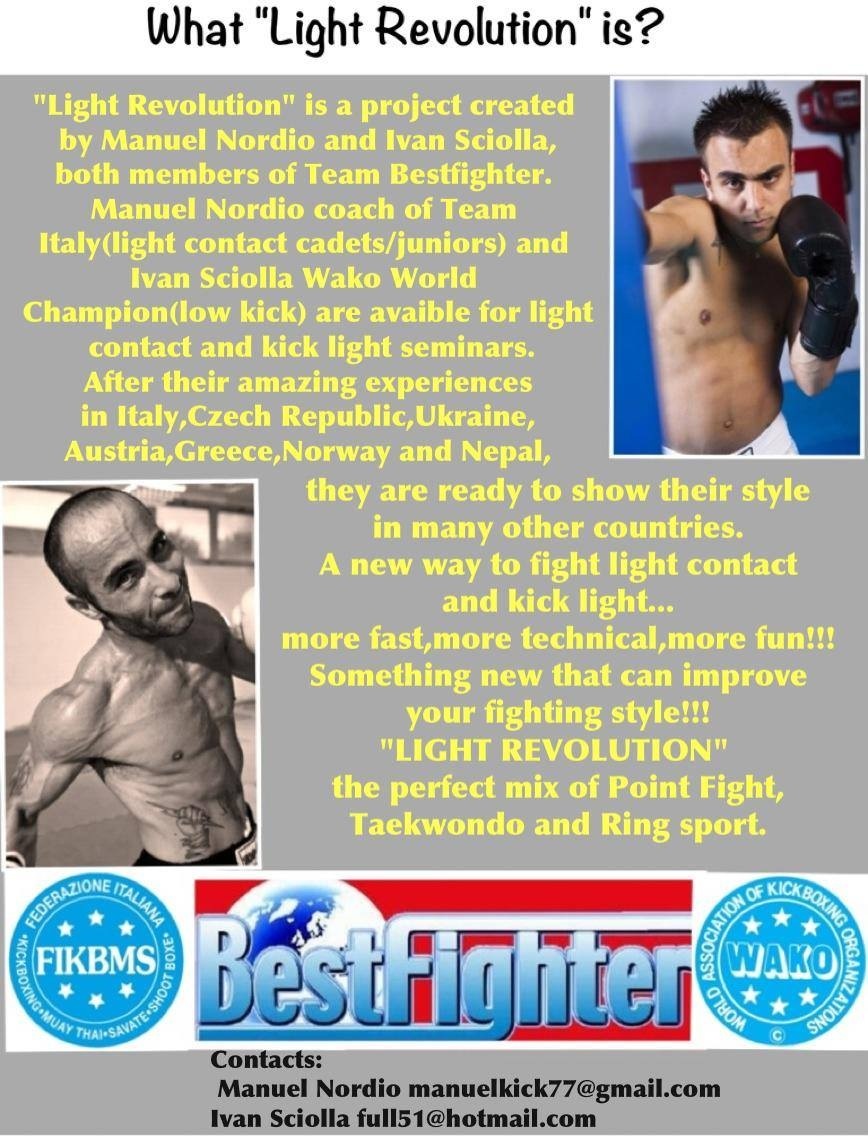 Welcome to our website,here you can find everything you need to arrange your LIGHT REVOLUTION seminar and to get our T-shirts and sweaters. Our seminars are not only an opportunity for a kick boxing meeting,but also a moment to share opinions and new ideas about light contact and kick light. We are fighting and working in FIKBMS and WAKO since 30 years getting experience and a new way to see our sport!!! What are you waiting for??? Contact us and arrange your date for LIGHT REVOLUTION, but remember....go hard or go home!!!